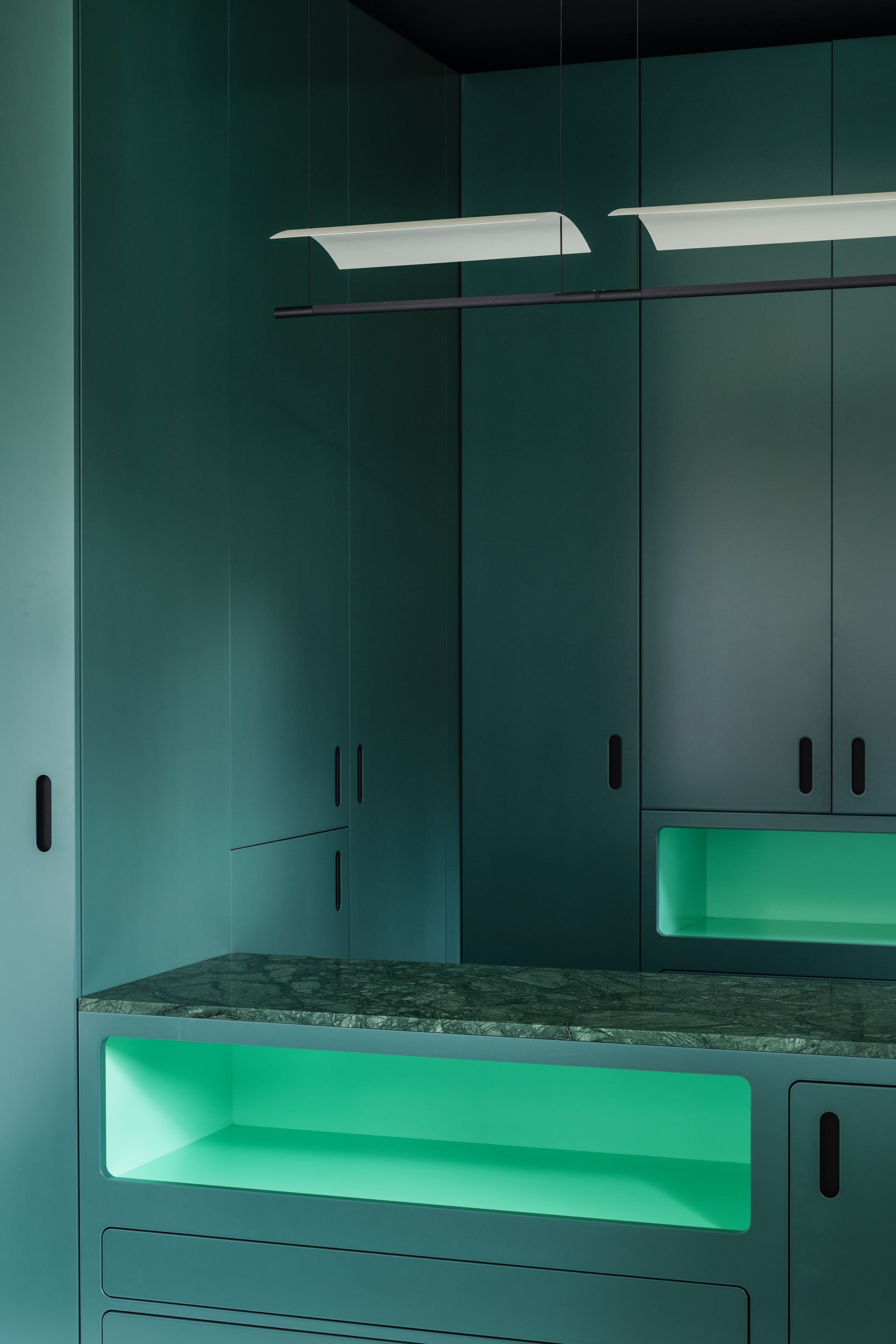 In the colour defined spaces of the residential entity, we’ve added a peaceful green - defining the dressing.